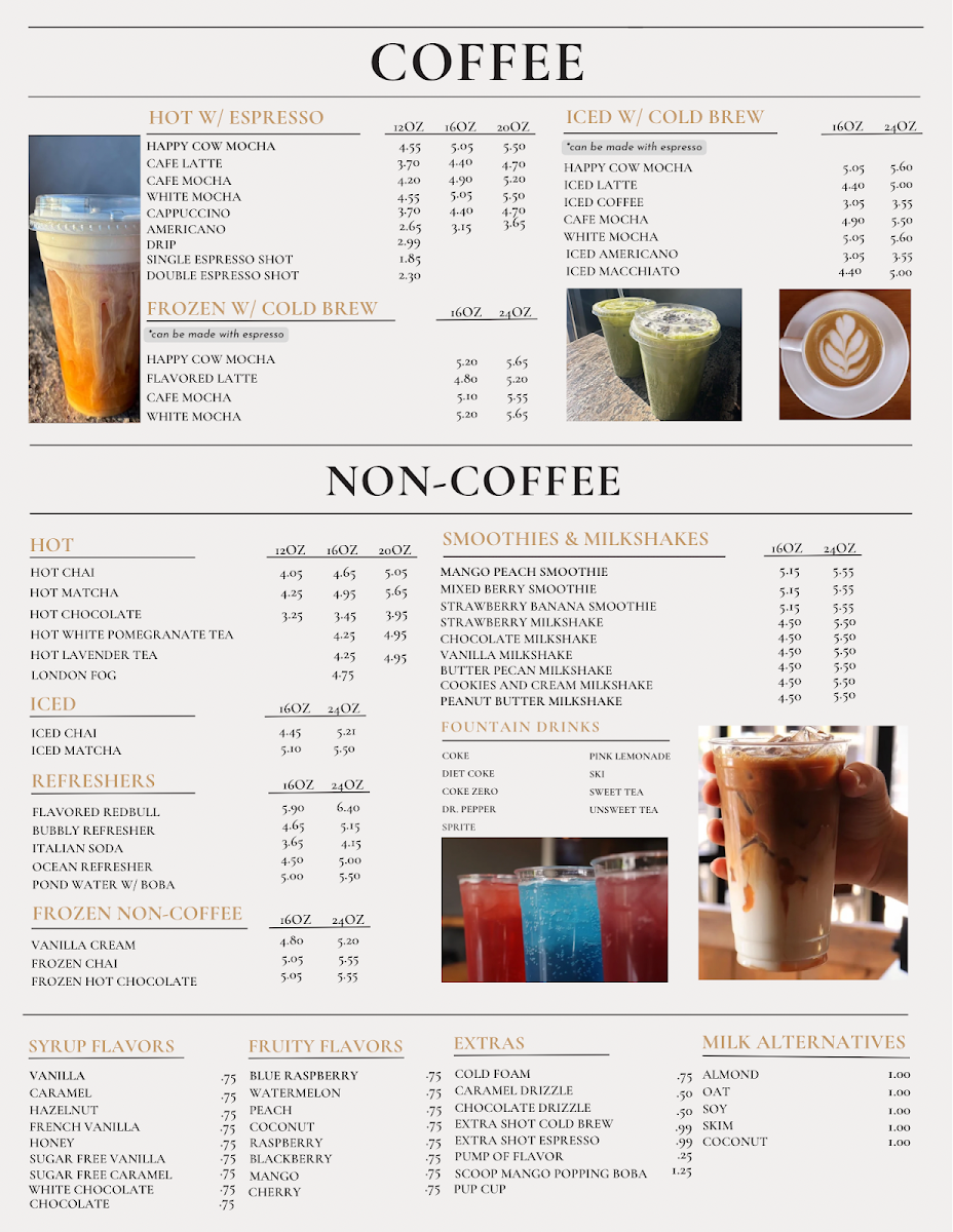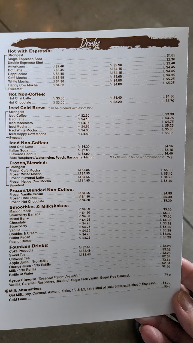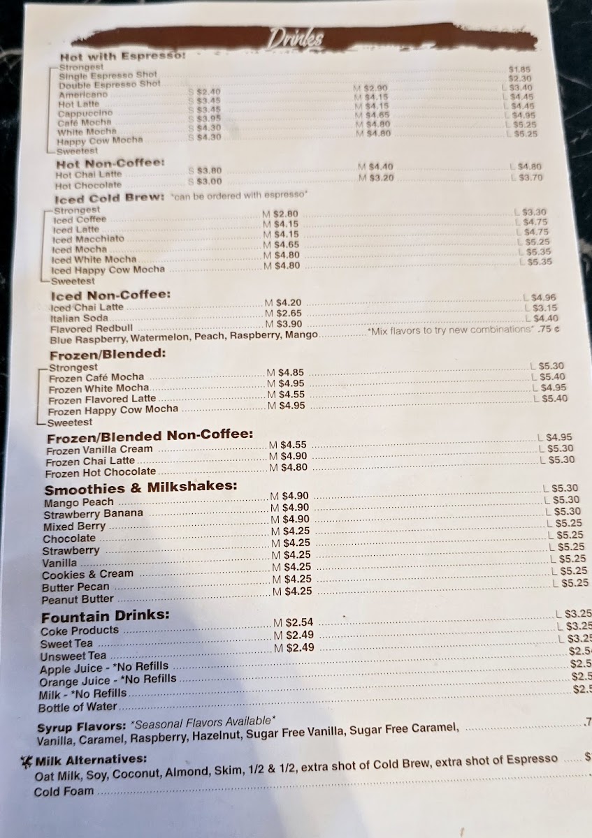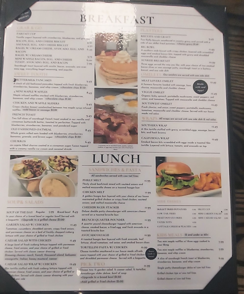 From a reviewer’s perspective, the menu at Happy Cow Cafe offers a comforting and well-rounded selection that reflects its casual, hometown charm. Starting with drinks, the café caters perfectly to coffee lovers with options like Single Espresso Shot, Double Espresso Shot, Americano, Hot Latte, and Cappuccino, providing everything from a quick caffeine boost to a smooth, relaxing cup to enjoy on site. The pastry section keeps things simple yet inviting, with the classic Cinnamon Roll standing out as a sweet companion to any coffee order. For breakfast, the menu balances lighter and heartier choices, ranging from the refreshing Parfait Cup and Fruit Bowl to filling staples such as the Sausage Biscuit, Bacon, Egg, and Cheese Biscuit, and the flavorful Fried Chicken Biscuit, making it easy to satisfy different morning cravings. Lunch continues this approachable style with comforting and familiar dishes like Soup of the Day, Garden Salad w/ Chicken, Caesar Salad w/ Chicken, Chicken Caesar Salad Wrap, and the indulgent Philly Melt, appealing to both those seeking something light and those wanting a more substantial meal. The Kids Menu is thoughtfully designed, offering kid-friendly favorites such as 2 Mini Waffles w/ Eggs, 2 Mini Waffles w/ Fruit, French Toast w/ Fruit, Cheeseburger w/ Cowtail Fries, and Grilled Chicken w/ Cowtail Fries, ensuring younger guests feel just as considered. To round out any meal, the sides selection-including Skillet Fried Potatoes, Cowtail Fries, Sweet Potato Fries, Tater Tots, and Cottage Cheese and Peaches-adds flexibility and comfort. Overall, the Happy Cow Cafe menu feels cohesive and welcoming, bringing together classic café beverages, satisfying meals, and family-friendly options into a lineup that leaves a positive and complete impression.