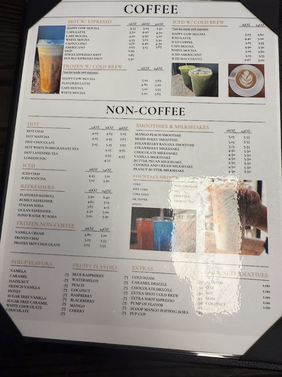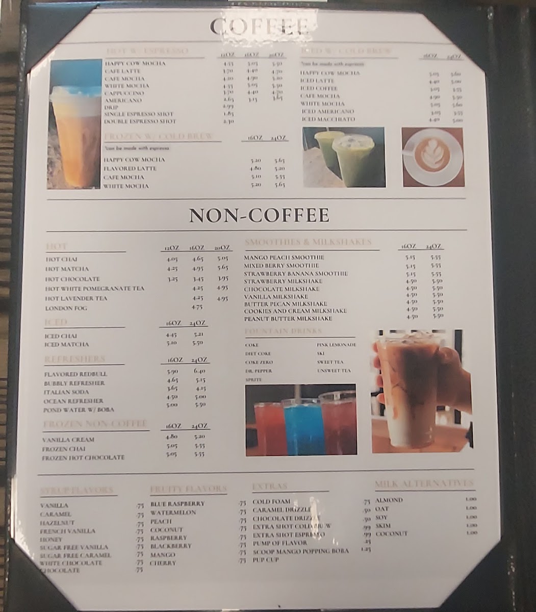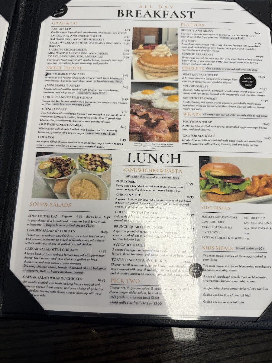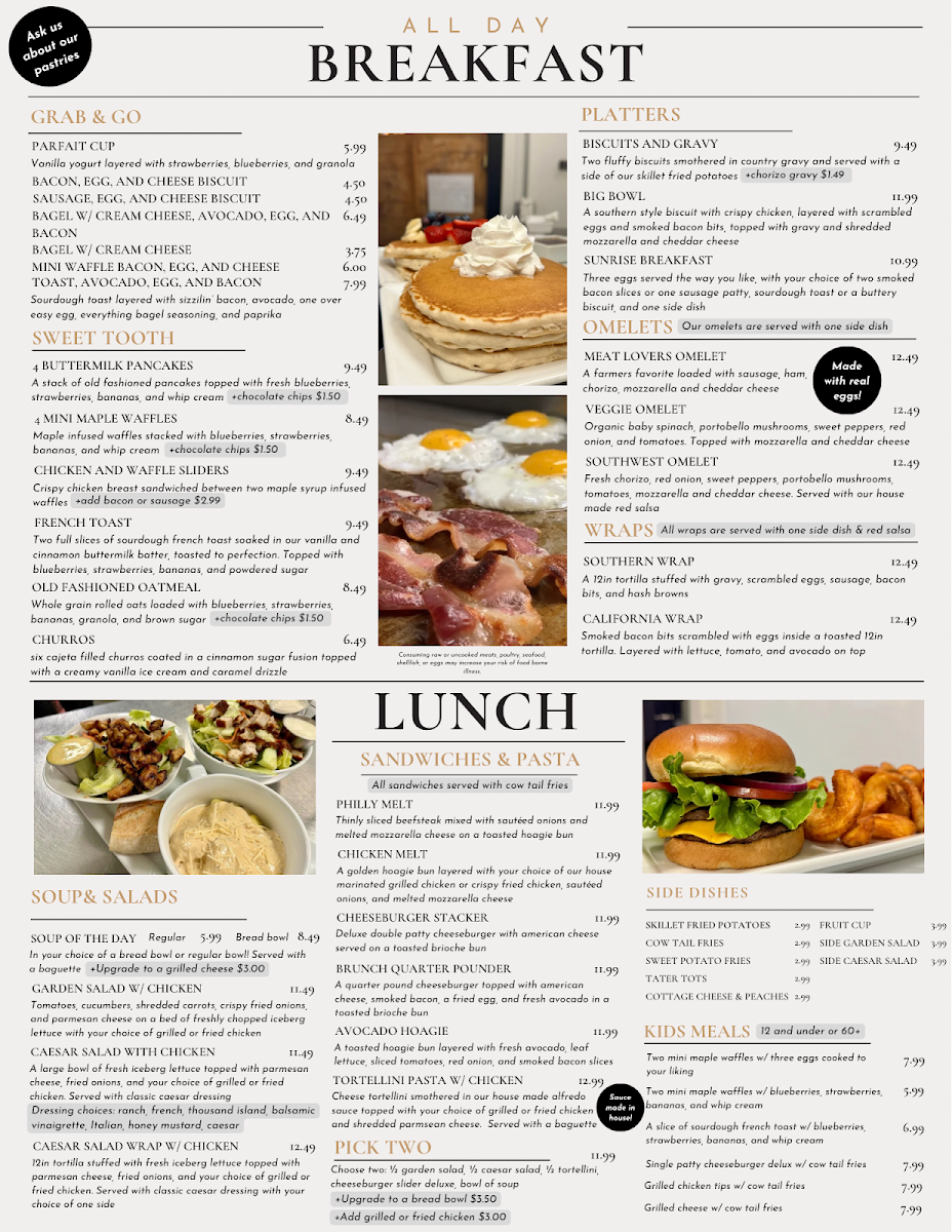 From a reviewer’s perspective, the menu at Happy Cow Cafe offers a comforting and well-rounded selection that reflects its casual, hometown charm. Starting with drinks, the café caters perfectly to coffee lovers with options like Single Espresso Shot, Double Espresso Shot, Americano, Hot Latte, and Cappuccino, providing everything from a quick caffeine boost to a smooth, relaxing cup to enjoy on site. The pastry section keeps things simple yet inviting, with the classic Cinnamon Roll standing out as a sweet companion to any coffee order. For breakfast, the menu balances lighter and heartier choices, ranging from the refreshing Parfait Cup and Fruit Bowl to filling staples such as the Sausage Biscuit, Bacon, Egg, and Cheese Biscuit, and the flavorful Fried Chicken Biscuit, making it easy to satisfy different morning cravings. Lunch continues this approachable style with comforting and familiar dishes like Soup of the Day, Garden Salad w/ Chicken, Caesar Salad w/ Chicken, Chicken Caesar Salad Wrap, and the indulgent Philly Melt, appealing to both those seeking something light and those wanting a more substantial meal. The Kids Menu is thoughtfully designed, offering kid-friendly favorites such as 2 Mini Waffles w/ Eggs, 2 Mini Waffles w/ Fruit, French Toast w/ Fruit, Cheeseburger w/ Cowtail Fries, and Grilled Chicken w/ Cowtail Fries, ensuring younger guests feel just as considered. To round out any meal, the sides selection-including Skillet Fried Potatoes, Cowtail Fries, Sweet Potato Fries, Tater Tots, and Cottage Cheese and Peaches-adds flexibility and comfort. Overall, the Happy Cow Cafe menu feels cohesive and welcoming, bringing together classic café beverages, satisfying meals, and family-friendly options into a lineup that leaves a positive and complete impression.
