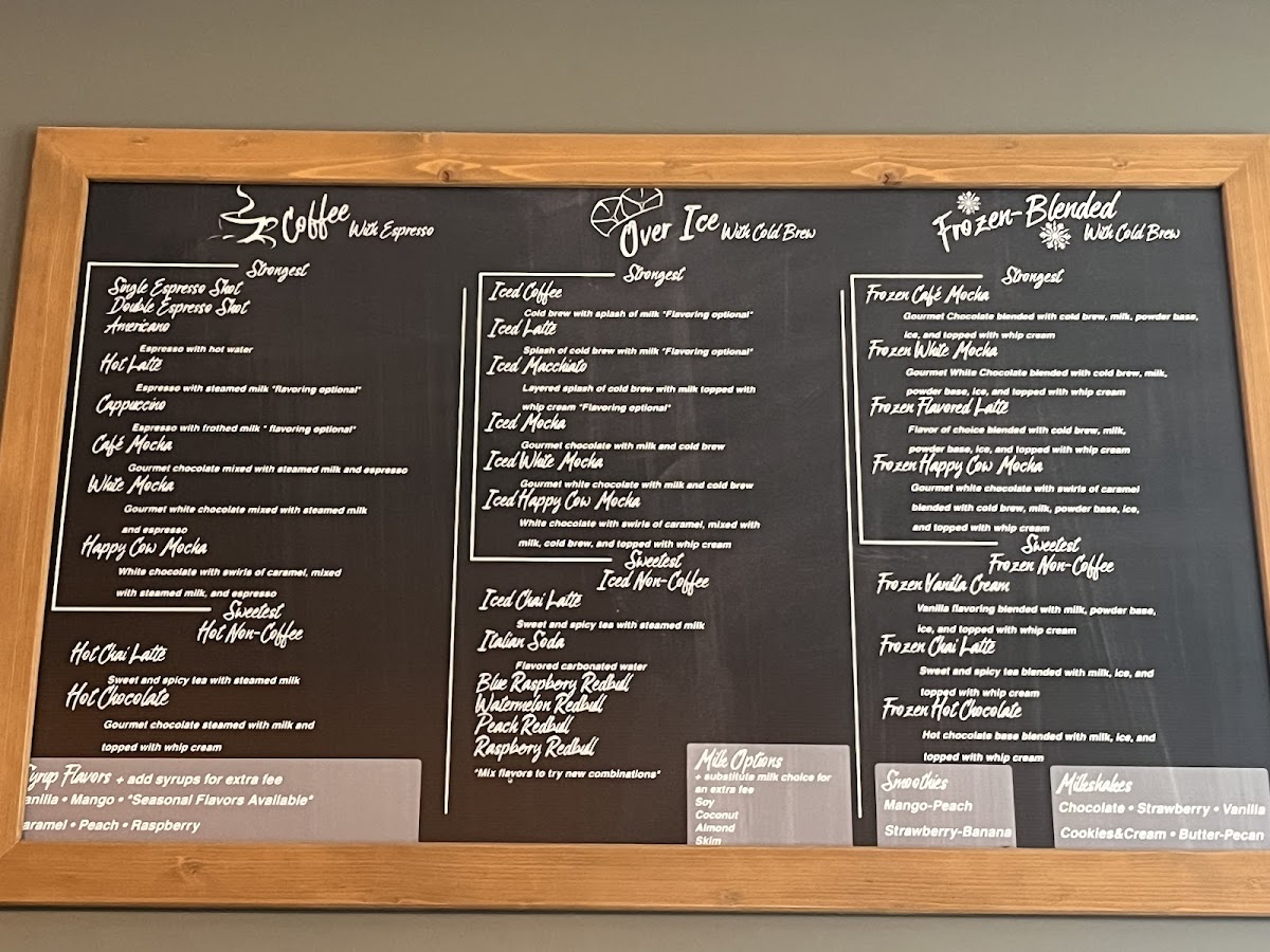 Frozen drink base, vanilla syrup, and your choice of milk. Blended with ice and topped with whipped cream. *non coffee option*